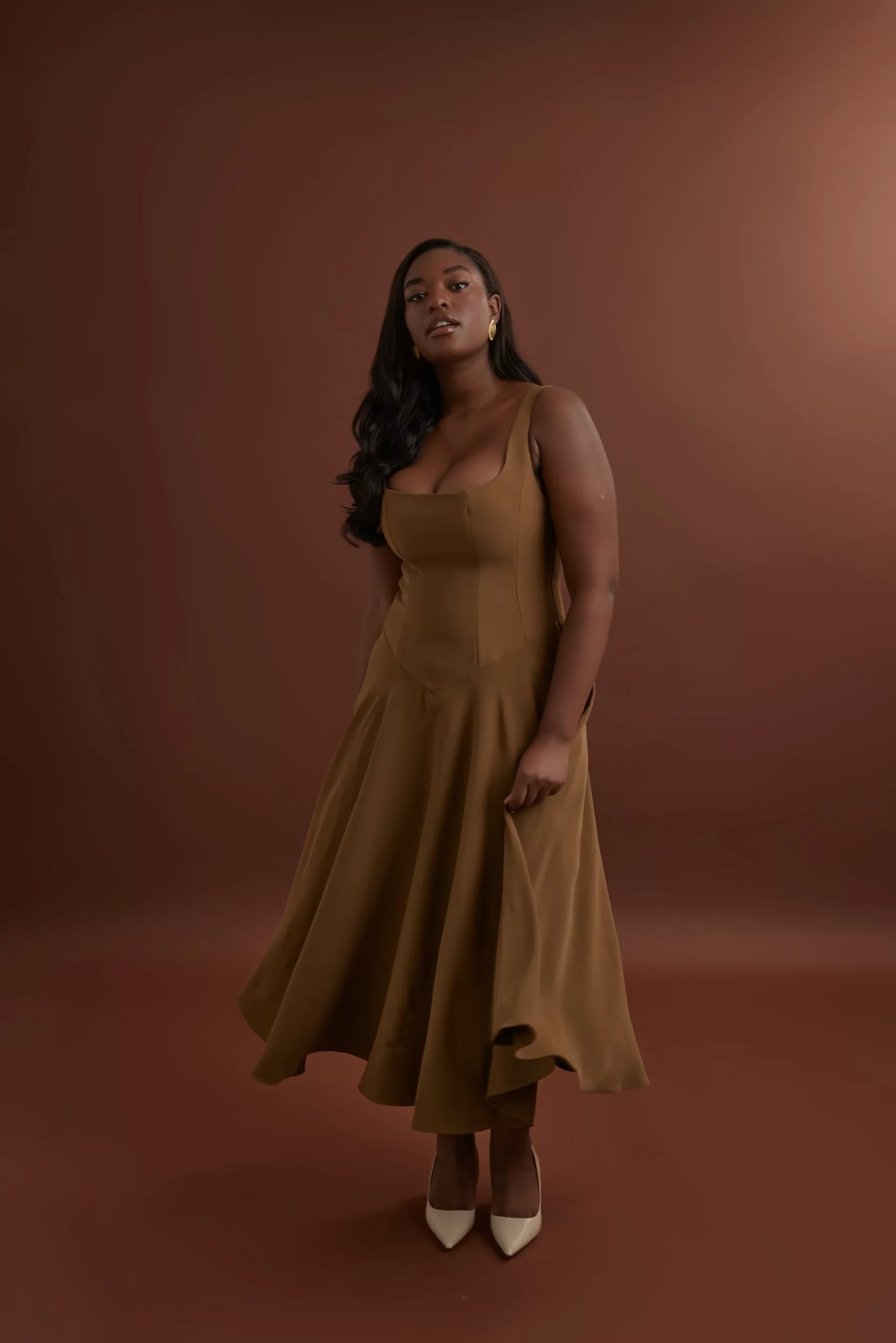 We’ve taken our coveted square neck midi and dropped the waist. Crafted in a olive hue, this piece features a flattering square neckline and the most elegant shaping with built in cups to support our muses. If elegance was a dress, she would be it with a low waist finish for a whole new look.